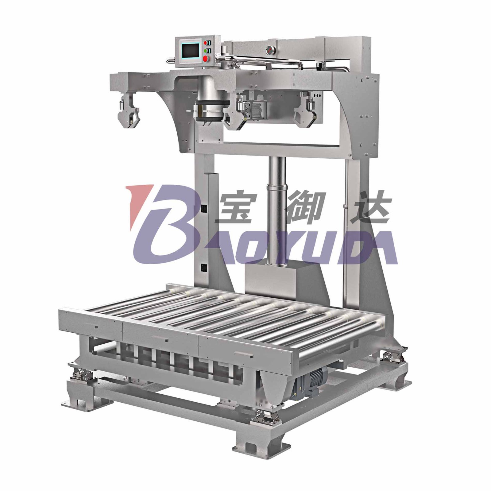 托袋震动功能,托盘从输送机滚筒间距中穿过,在包装过程中,当袋子内的物料架桥时,通过震动可将袋子内的物料破供振实。